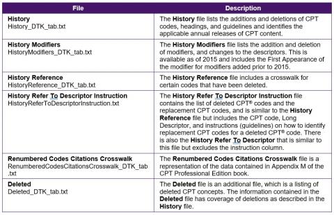 The History file lists the additions and deletions of CPT codes and headings and identifies the applicable annual releases of CPT content. The History file has the following scope: