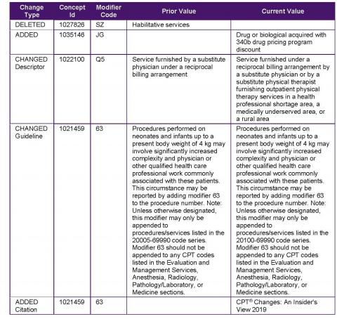 - Modifiers – A list of modifiers to be used with CPT codes.