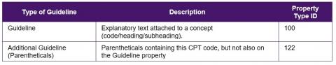 - The property type 100 for Guidelines, which can apply to a section, code or modifier level.