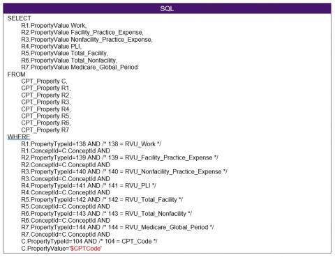 The following SQL statement can be used to retrieve the "regular" RVUs for a CPT® code. To retrieve RVUs for a HCPCS Level II code, change 104 to 136 (HCPCS Level II Code).
