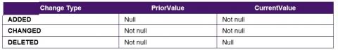 The History file contains columns PriorValue and CurrentValue. The column will be null, depending on the type of change: