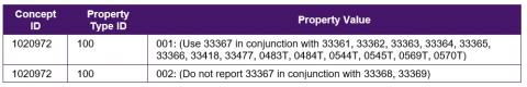 For the Report With rows, Code 1 contains the add-on code while Code 2 contains the primary code. This means that 33367 is an add-on code and MUST be reported in conjunction with the primary code 33361 or 33362 (among other primary codes not shown in the table). For the Exclude rows, Code 1 and Code 2 MUST NOT be reported together. This means code 33367 MUST NOT be reported with 33368 or 33369. The human-readable guidelines are stored in the Property file.